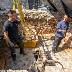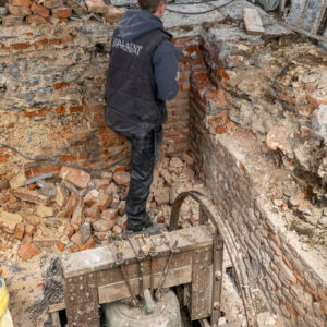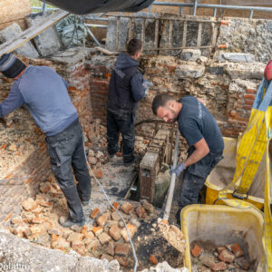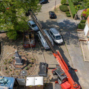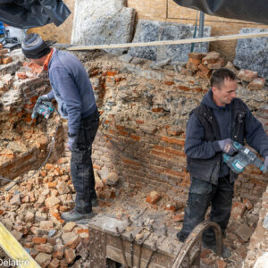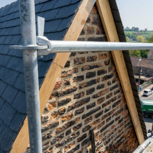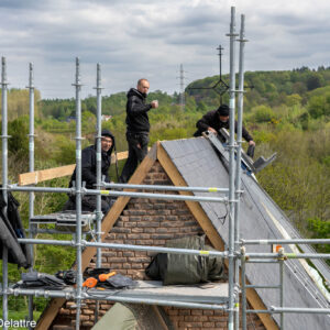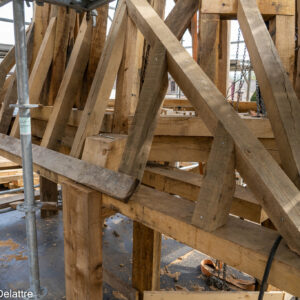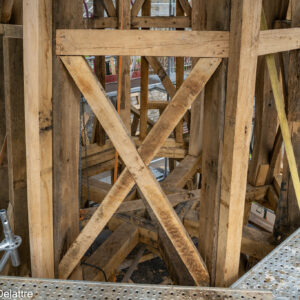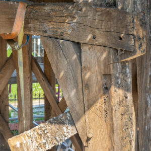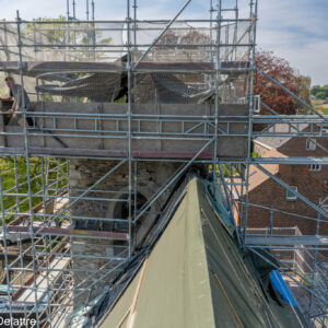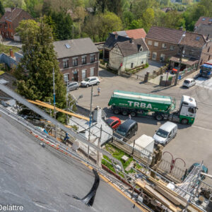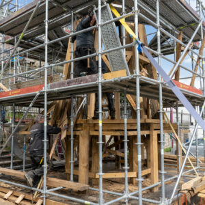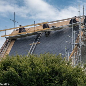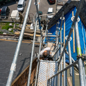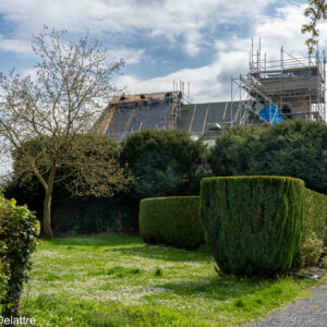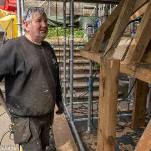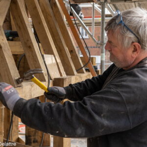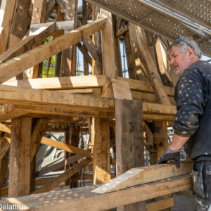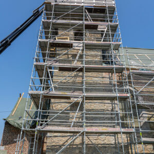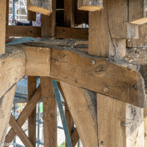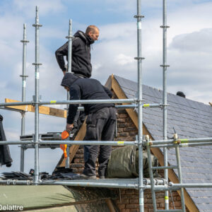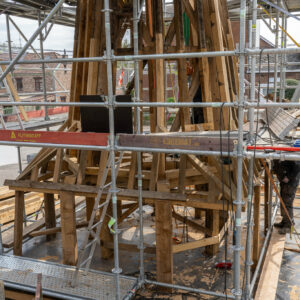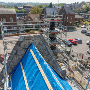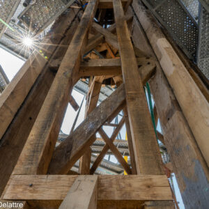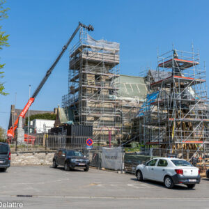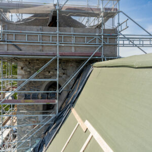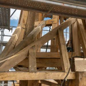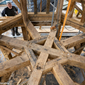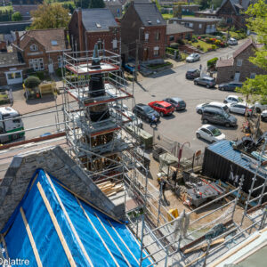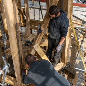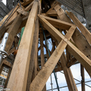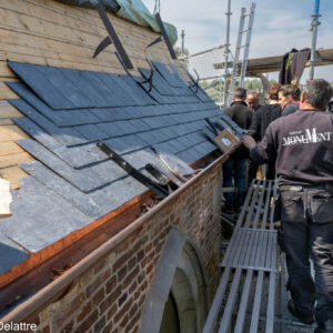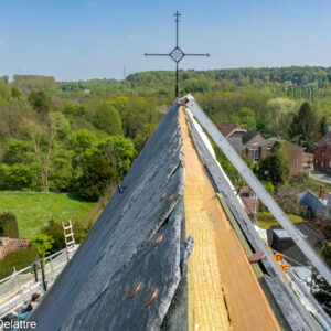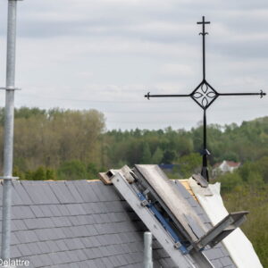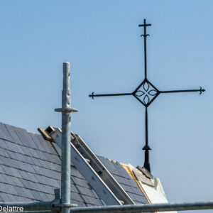 Les travaux de restauration de la charpente de la flèche du clocher s’est poursuivie cette semaine ainsi que la pose des ardoises sur la toiture du choeur. La nouvelle croix a été placée sur le choeur en remplacement de l’ancienne disparue il y a plus de 25 ans suite à une tempête. Le démontage de la maçonnerie à l’intérieur de la partie supérieure de la tour du clocher a été rendu nécessaire suite à sa dégradation par l’humidité.
