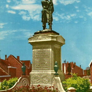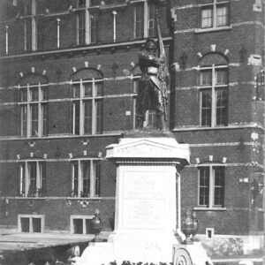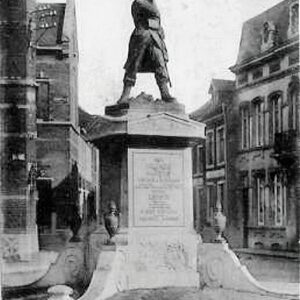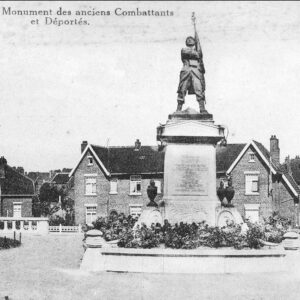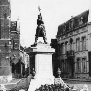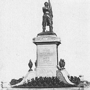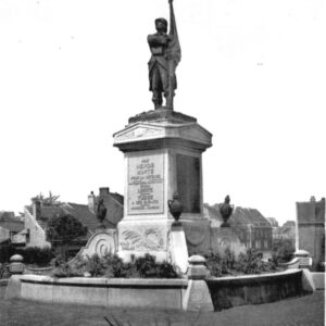 Monument composé d’un piédestal en marbre blanc posé sur un socle surmonté d’un soldat en bronze tenant le drapeau : œuvre du sculpteur Edmond FALISE et du fondeur LEMPEREUR.