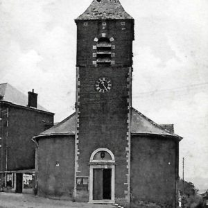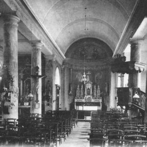 Les murs étaient construits de pierre de sable. On y descendait par trois degrés comme dans une cave. Elle n’avait que 20 pieds jusqu’au plafond qui fut fait en 1752. Avant cette époque, les sommiers et les gîtes étaient à découvertes. Elle était longue de 47 pieds et large de 27 ce qui fait un total de 1269 pieds de surface. Il s’y trouvait 2 autels, les mêmes que ceux d’aujourd’hui, un confessionnal, une tribune pour le bourgmestre, la chaire de vérité, 16 bancs de particuliers, 30 chaises, l’escalier du jubé… Il y avait une petite porte au midi devant laquelle se trouvait un porche de 10 sur 8 pieds couvert d’un toit de pannes sous plafond et sans porte.