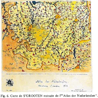 En effet, ils affirmaient qu’il suffirait de 19 écluses et d’une tranchée à ciel ouvert profonde de 45 m pour franchir la crête de partage. Cette solution provoqua aussitôt une levée de boucliers. Les uns la jugeaient douteuse, utopique, les autres, moins nombreux, la qualifiaient de “possible”. Finalement, se rangeant du côté des détracteurs, le gouverneur DEVELASCO, représentant du roi d’Espagne, Charles II, déclara le projet irréalisable. Le tracé avancé par les ingénieurs partait de Bruxelles par la vallée de la Senne jusqu’à Arquennes et Rénissart pour rejoindre la vallée du Piéton jusqu’à la Sambre. Notons que les cartes géographiques n’étaient, alors, guère répandues. Seule la carte de S’GROOTEN (fig. 6), publiée dans l’Atlas der Nederlanden” en 1573 pouvait guider les ingénieurs. Au demeurant, cette carte était de peu d’utilité car fort imprécise.