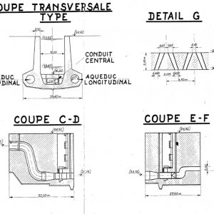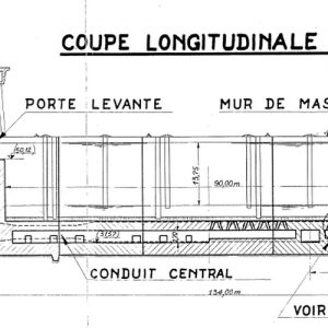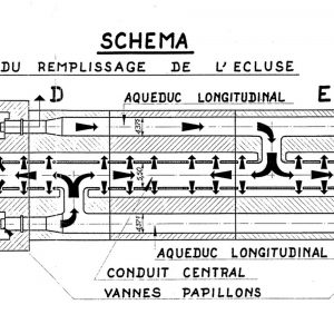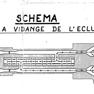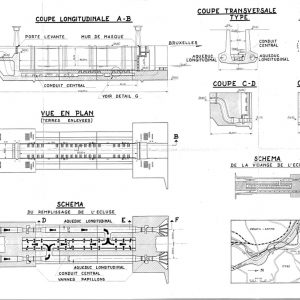 Les images ci après proviennent du plan d’étude de l’écluse datant de la fin des années 1950 et donnant une vue d’architecte de ce que serait un jour l’ouvrage.